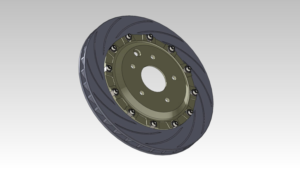 ローター前後355mm。ローターはデッキメカニカルパワーワンオフ製作。ホイールサイズに合わせて強度保ちつつベルハウジングを作成してもらい、フィニッシュはアルマイトブラック。
