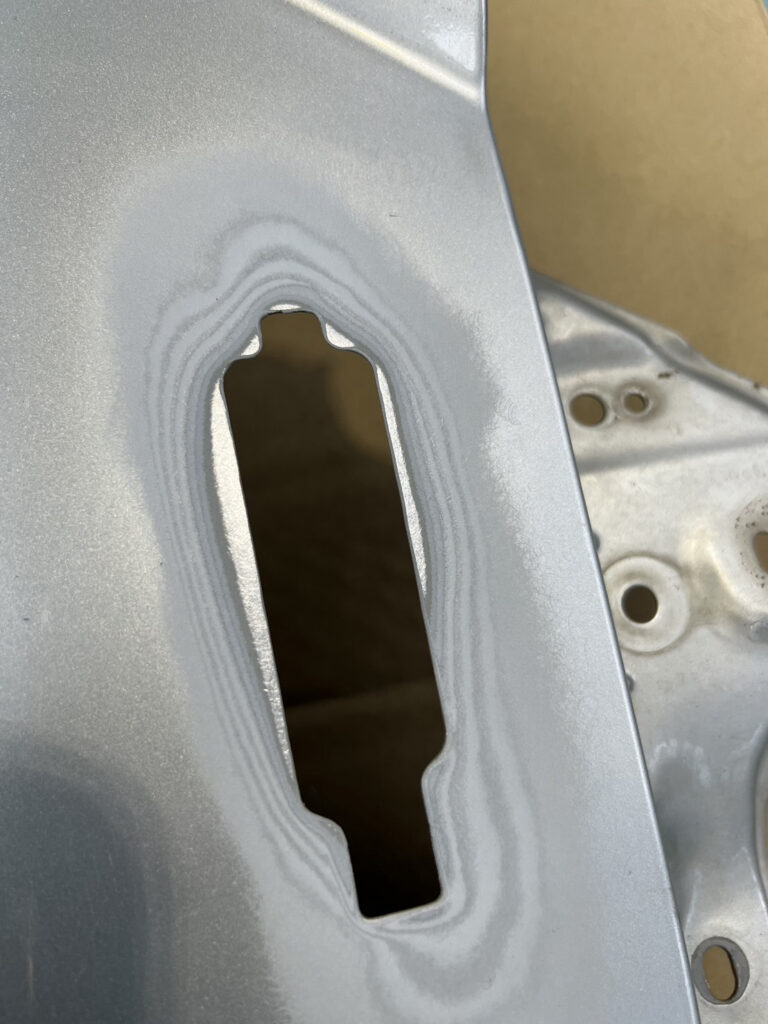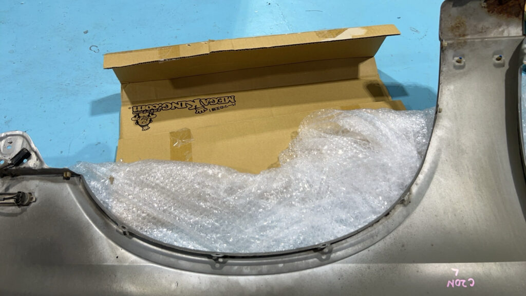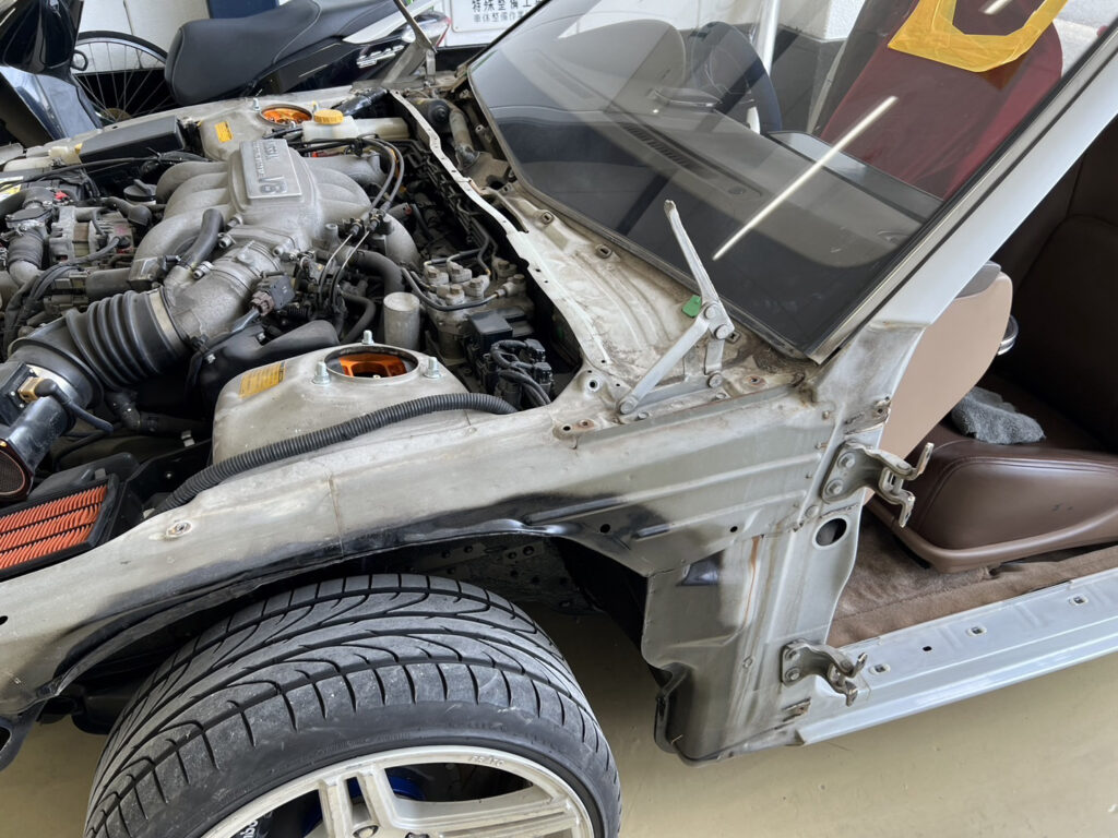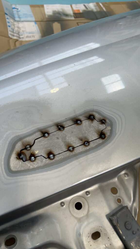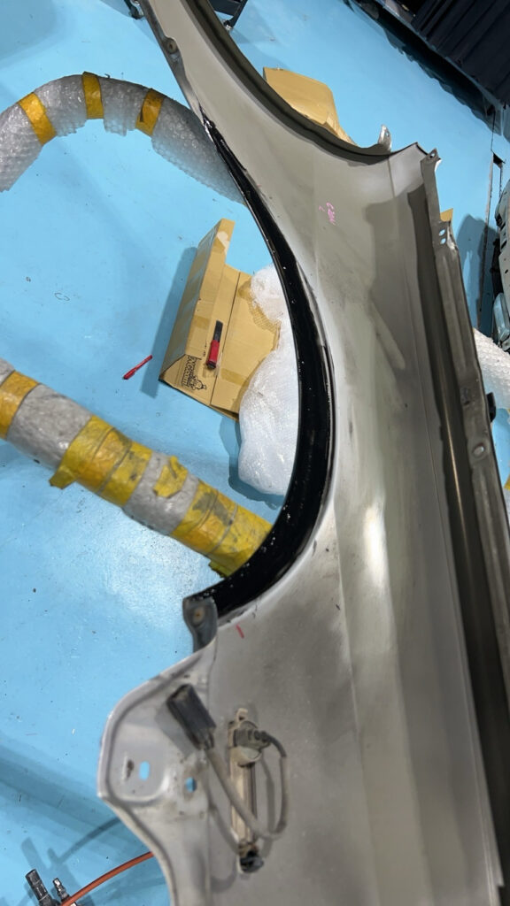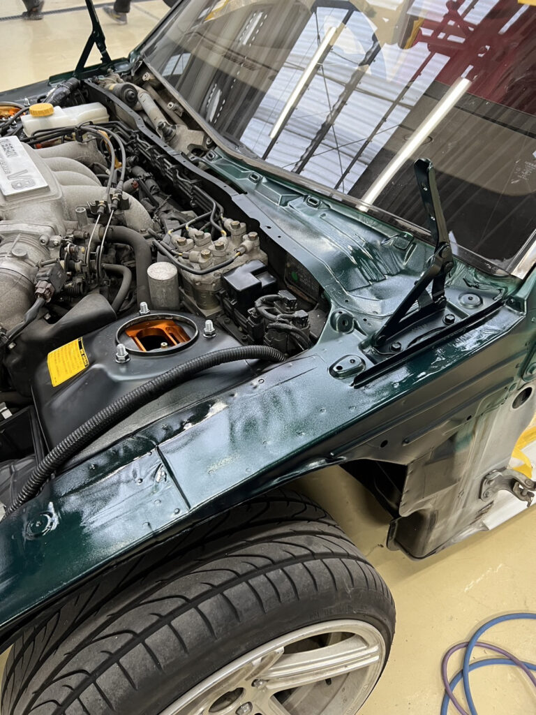 過去車どの車もスムージングをしてきたけど、半年ぐらい経つとスムージングした跡が見る角度によって出てきて毎回気になってたので。今回は鉄板をその形に切り抜き、点付け、パテをできるだけ使用せず、使用するパテもパテ痩せしにくい高級なものを使用し跡が出にくいように。