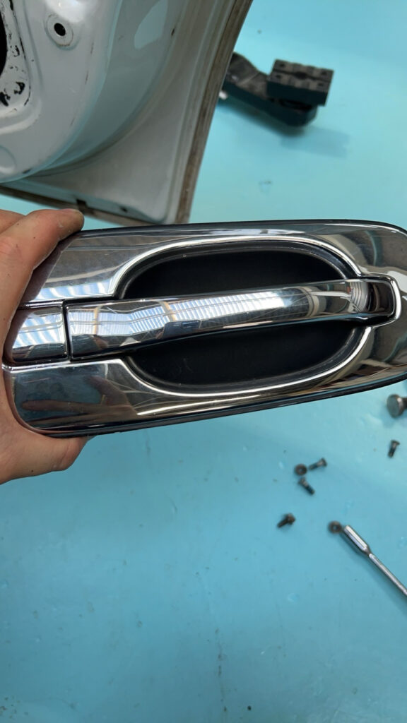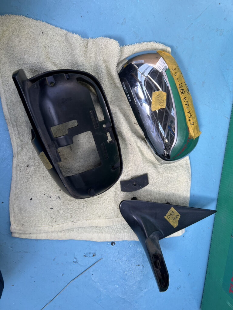 ドアミラー、ドアノブのメッキがやけに目立ってうるさいのでボディー同色に。全て同色にしてしまうと「いかにも塗ってますよ」感が出るので、ドアノブはノブの部分だけメッキを残し。